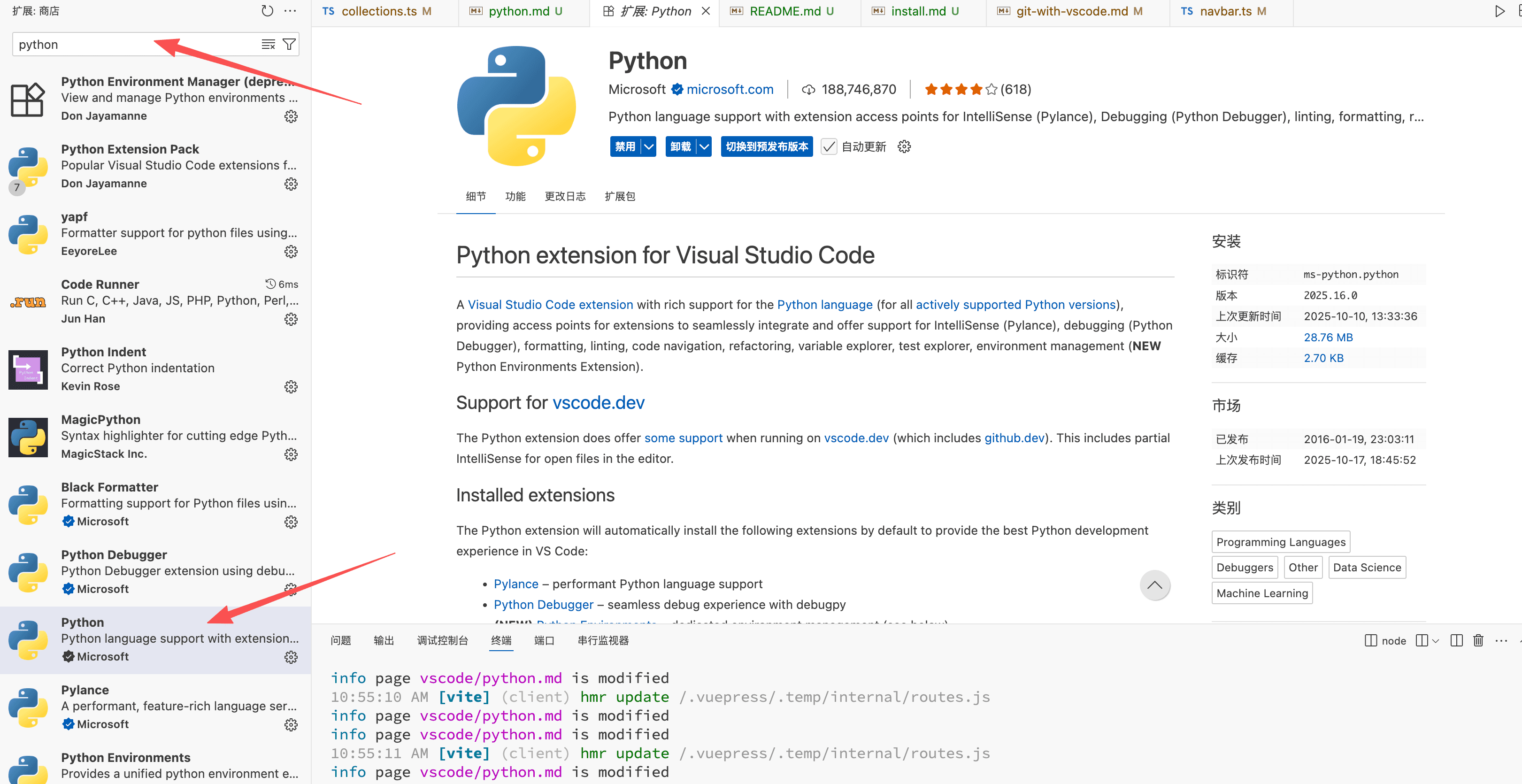 打开插件安装界面,然后搜索 Python,找到由 Microsoft 出品的插件后点击安装: