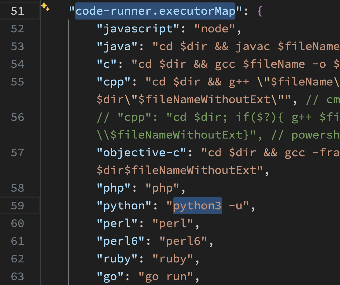 找到 code-runner.executorMap(可以通过快捷键 command + F 搜索),再在其中找到 python,将后面的 python -u 更改为 python3 -u。